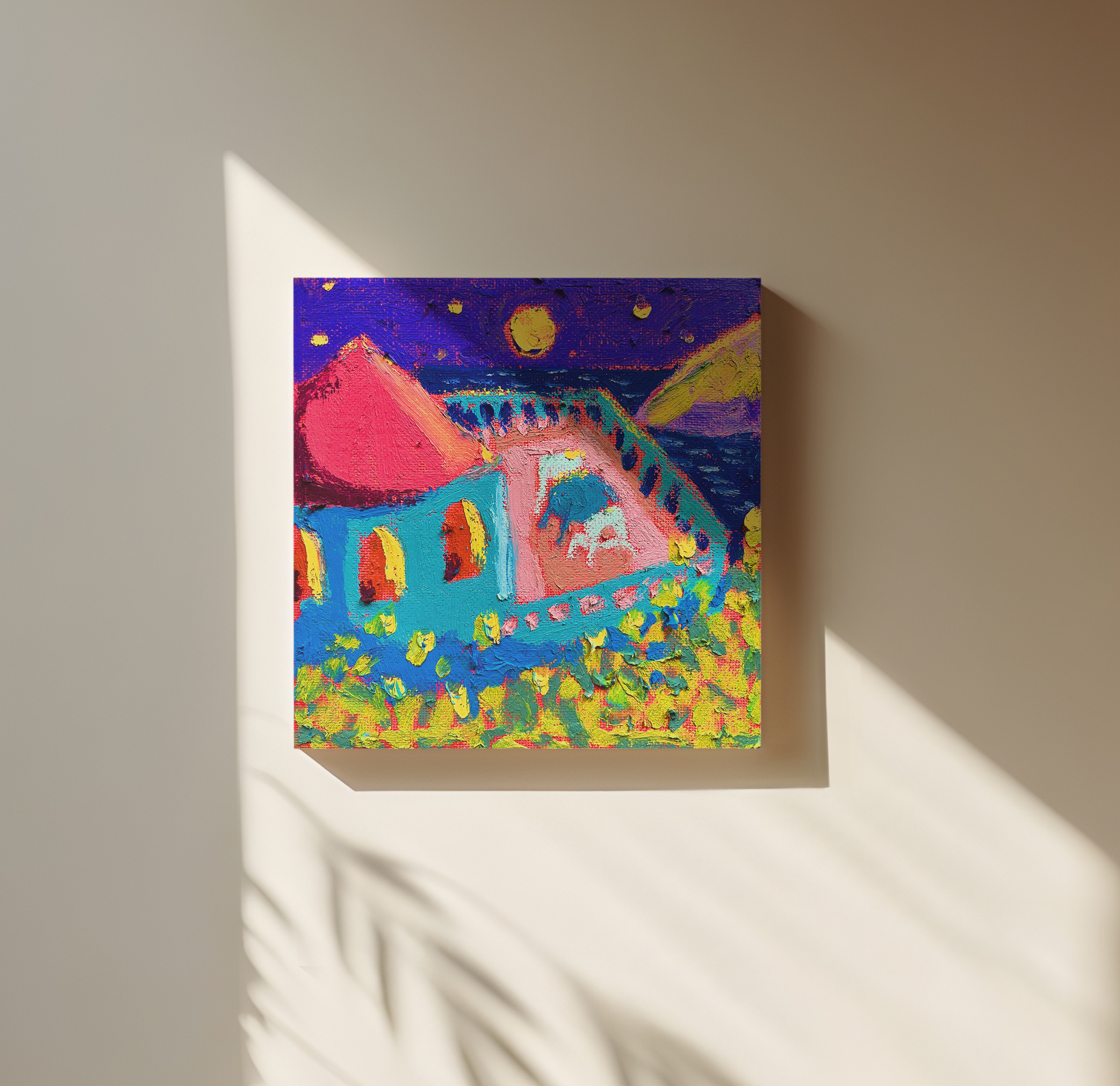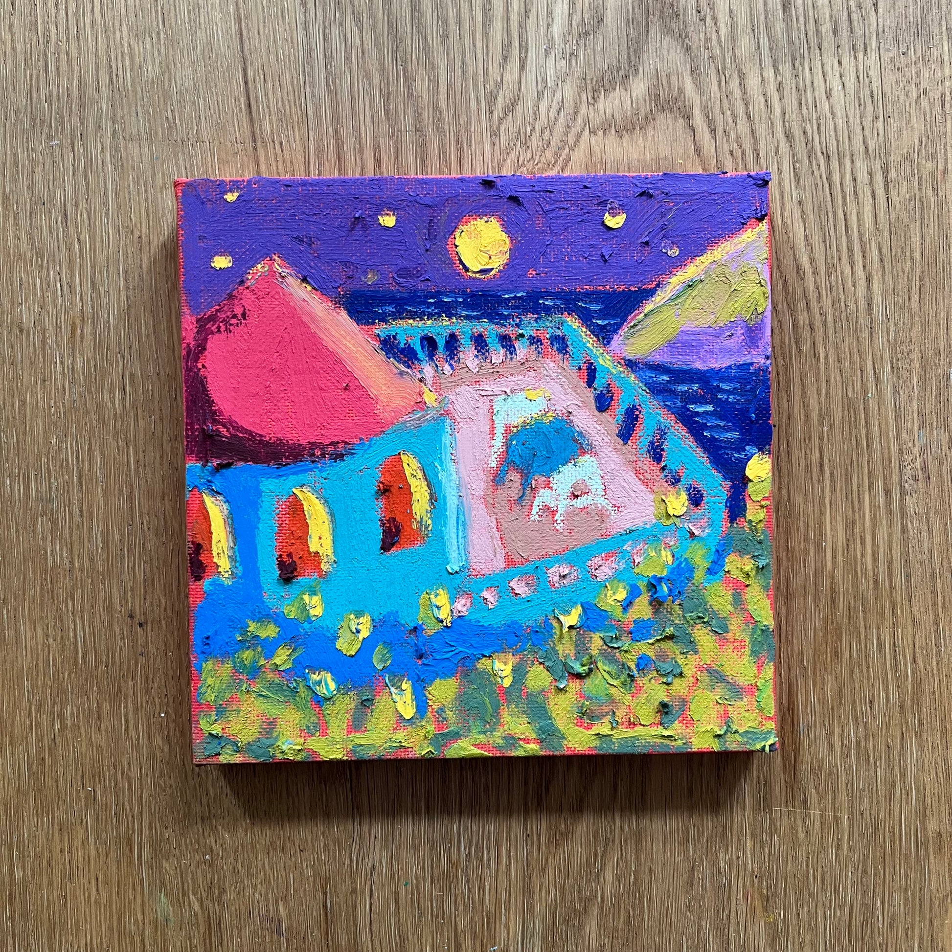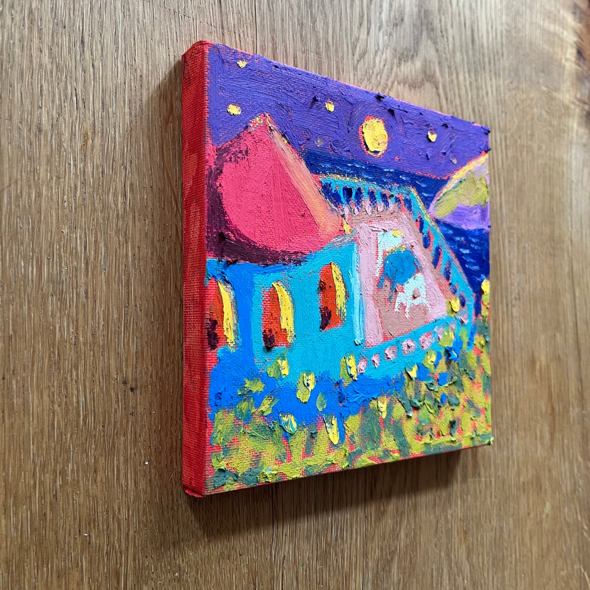 Painted with acrylics and oil pastels on canvas on a stretcher frame