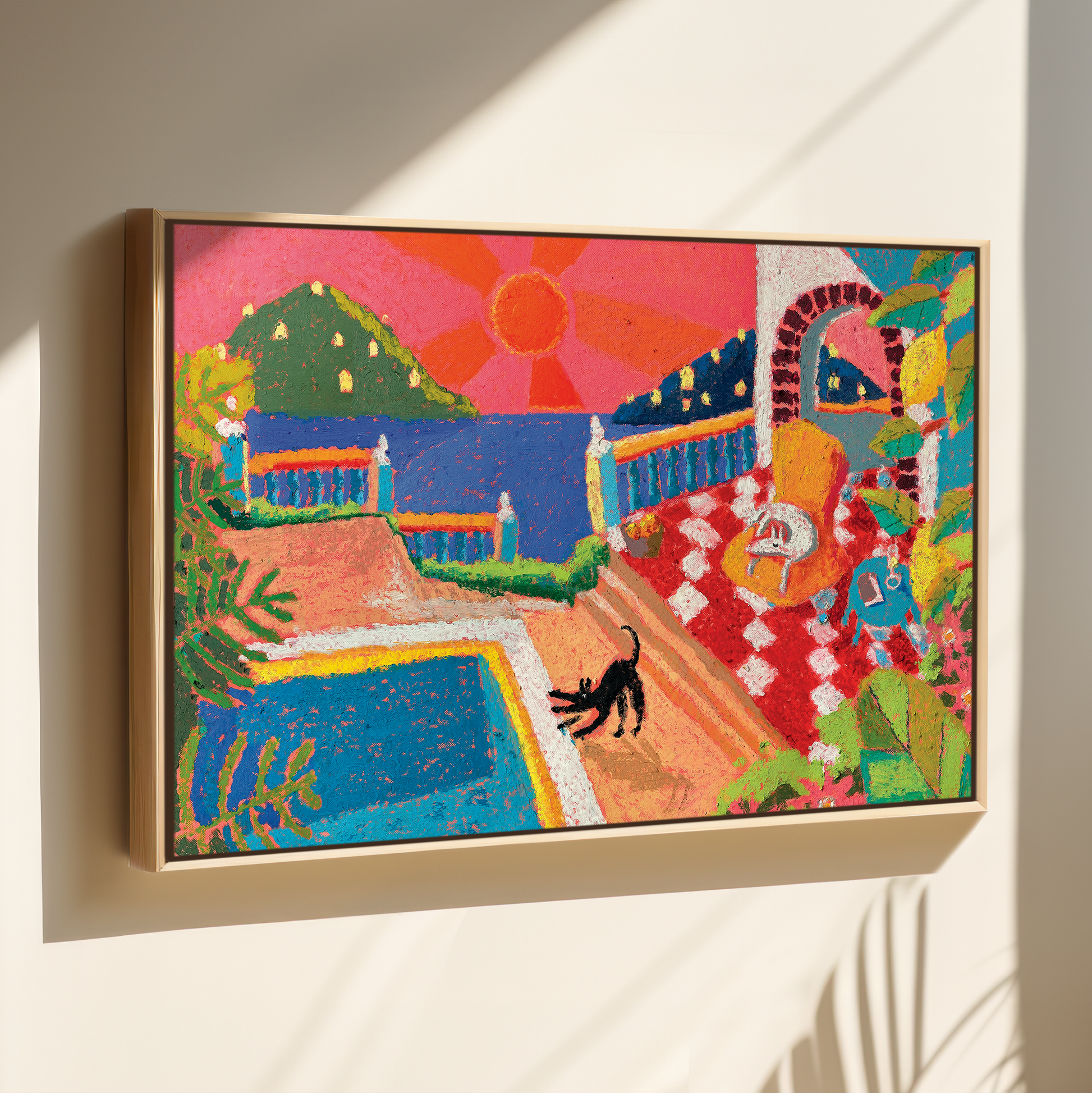 Painted with acrylics and oil pastels on canvas in wooden floater frame