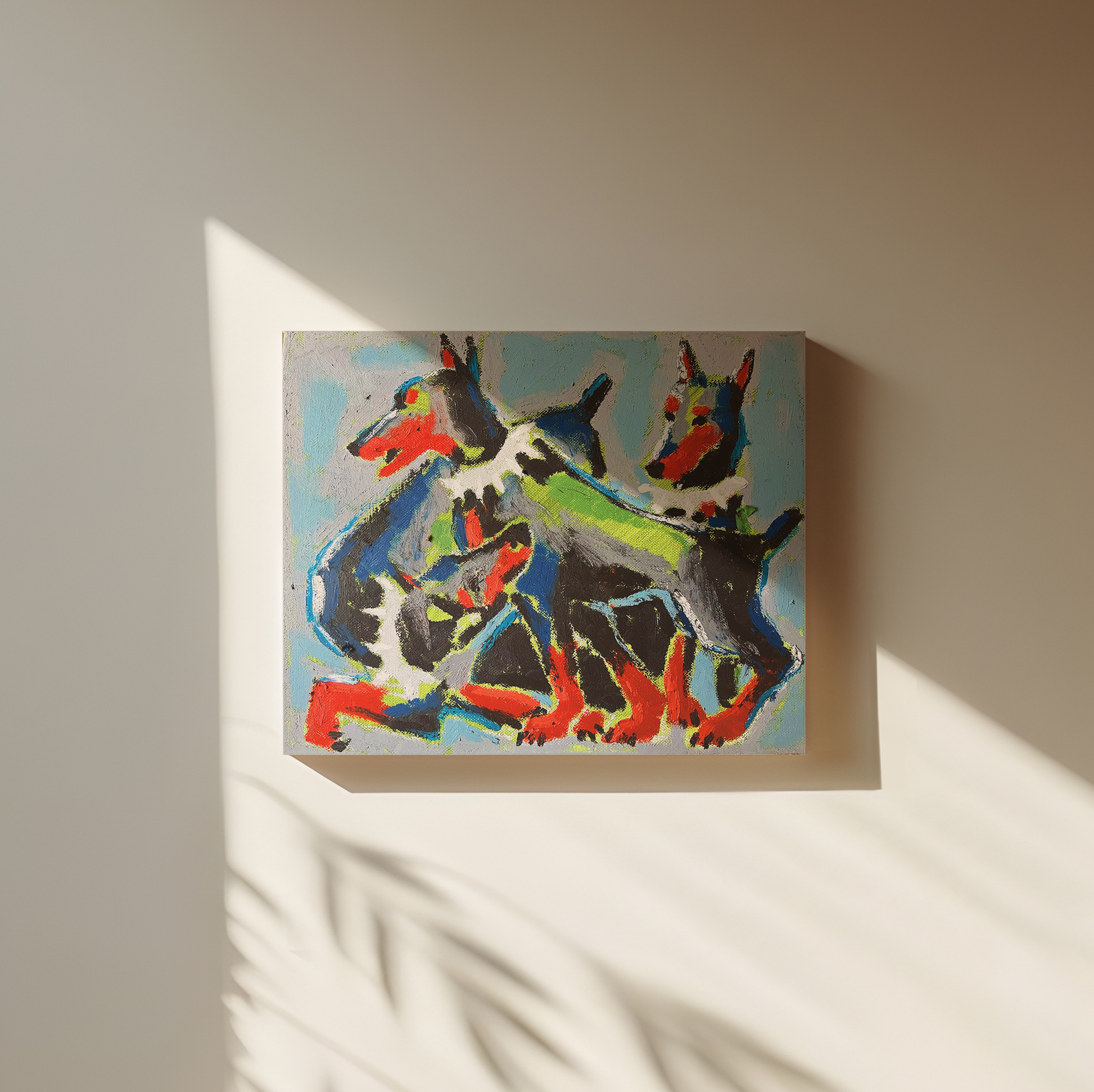 Painted with acrylics, oil and oil pastels on canvas on a stretcher frame