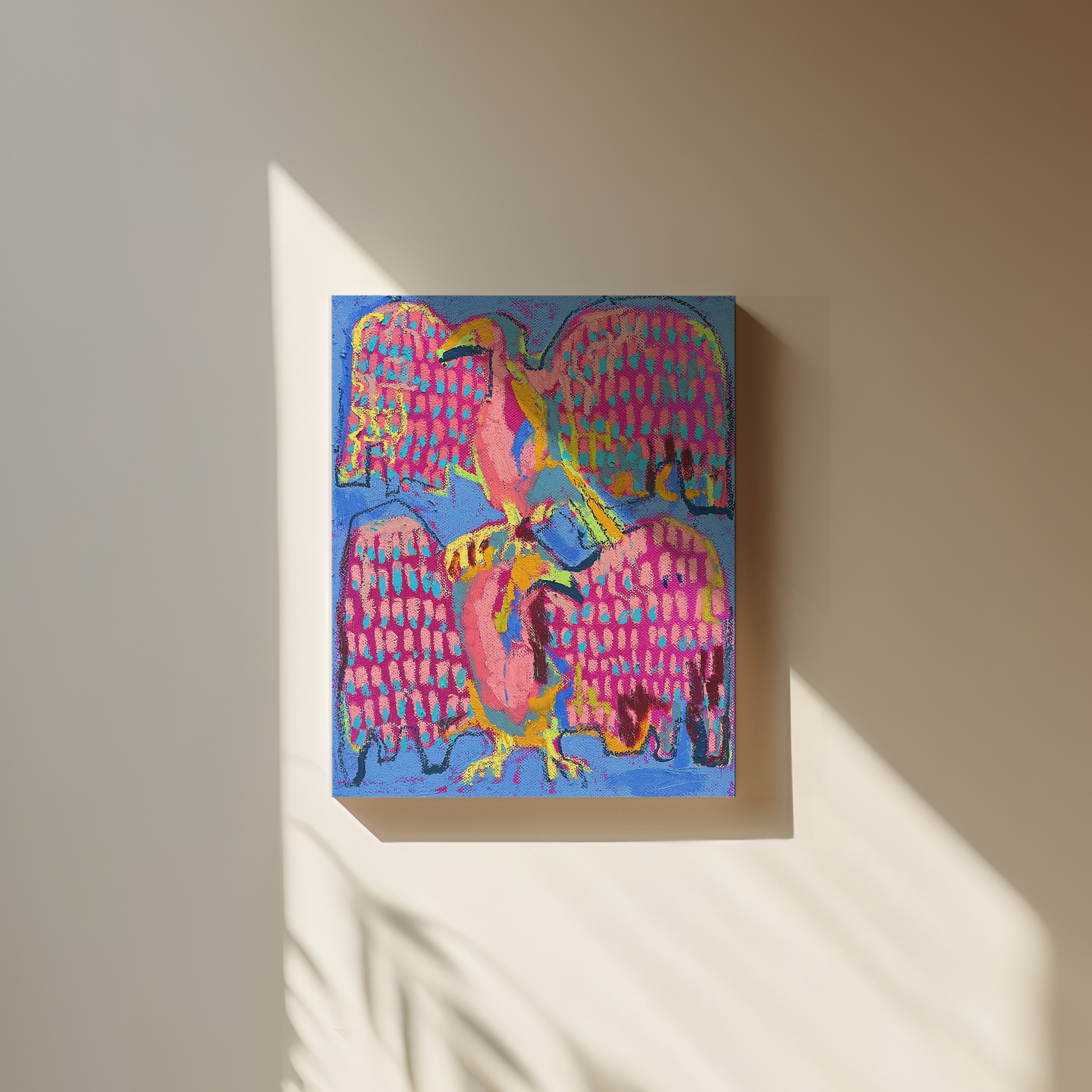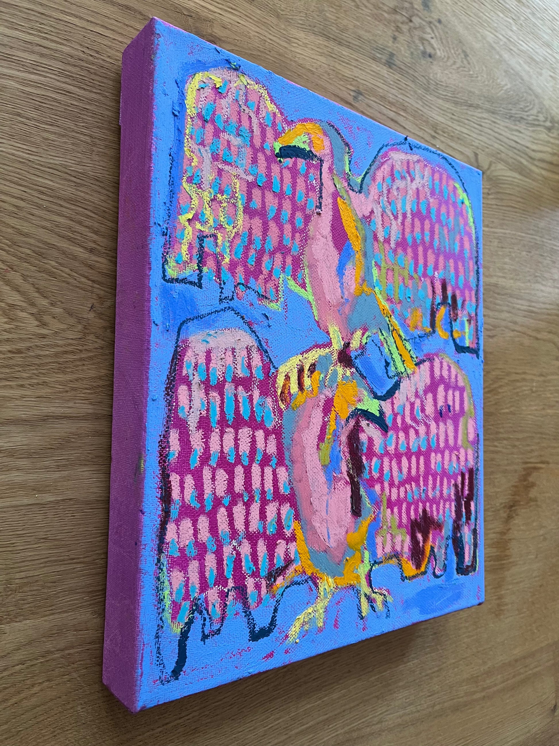 Painted with acrylics, oil and oil pastels on canvas on a stretcher frame