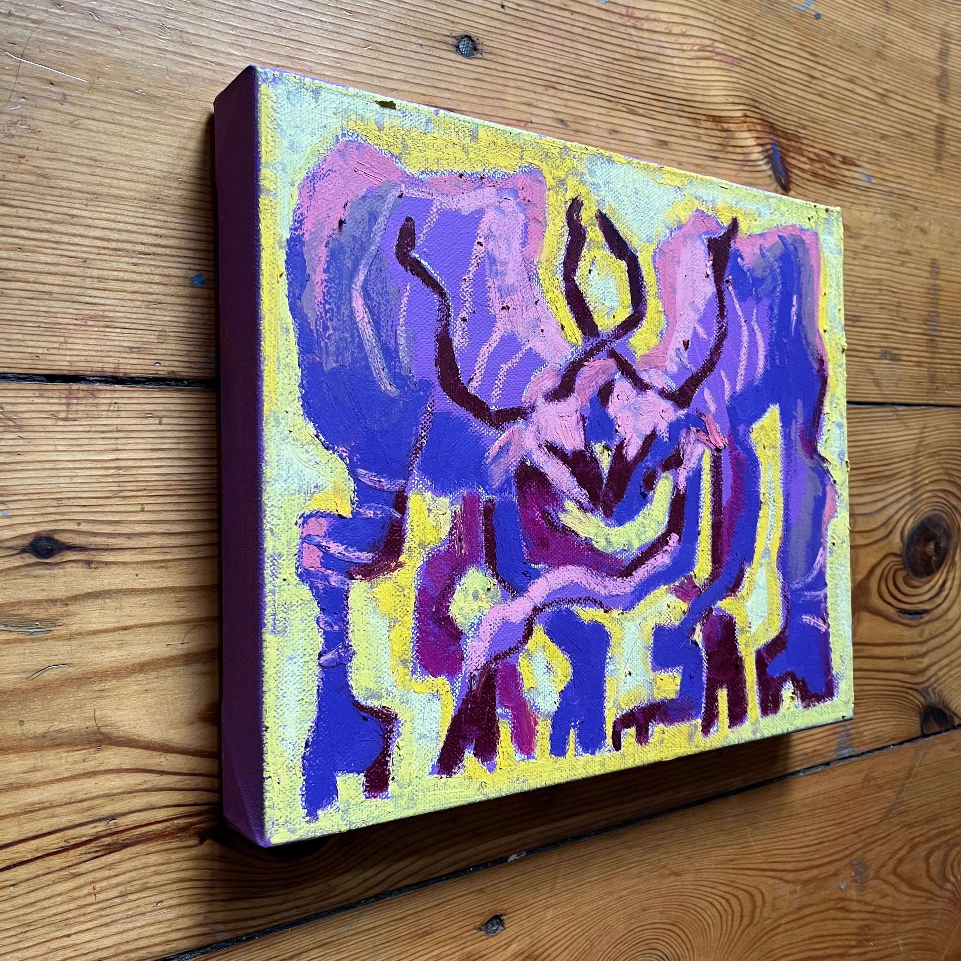 Painted with acrylics, oil and oil pastels on canvas on a stretcher frame