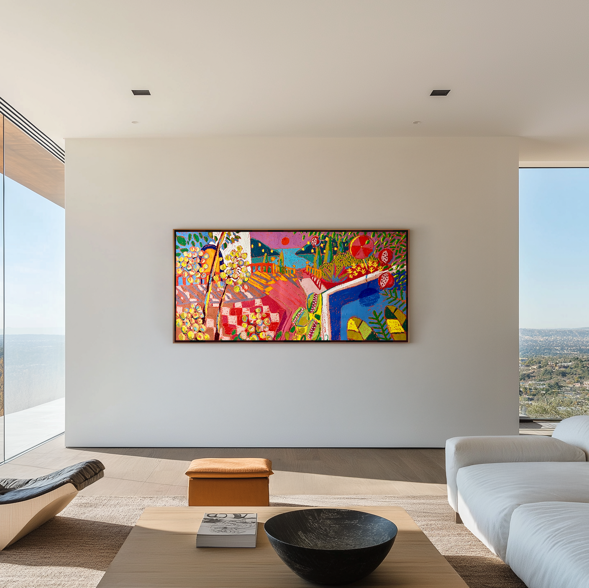The frame on the picture is for presentation reference and is not included, the purchase contains only the painted canvas.